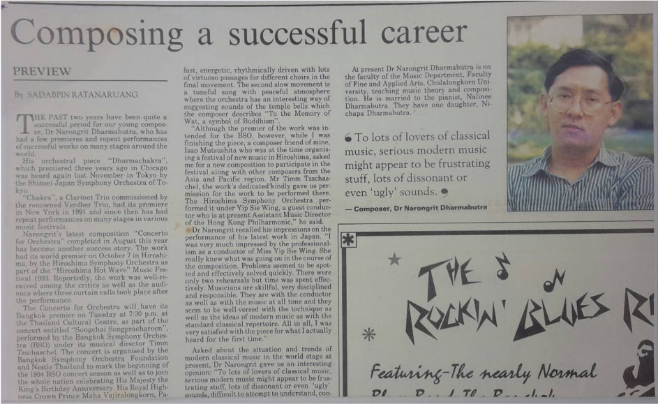 1. ผลงานบทประพันธ์เพลงที่สำคัญช่วงระหว่างปี พ.ศ. 2530-2533 1.1 กลางคืนและรุ่งเช้าในสกลจักรวาล (Night and Morning in the Spheres) ความยาว 10 นาที ประพันธ์ขึ้นในปี พ.ศ. 2530 เป็นซิมโฟนิกโพเอ็มสำหรับวงออร์เคสตราที่ได้รับแรงบันดาลใจจากวรรณกรรมเรื่องกามนิต กลางคืนและรุ่งเช้าในสกลจักรวาลได้รับการเผยแพร่ในโอกาสต่อไปนี้