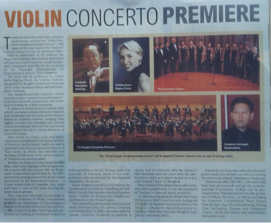 4. ผลงานบทประพันธ์เพลงที่สำคัญในช่วงระหว่างปี พ.ศ. 2549-2551 ผลงานในช่วงนี้เป็นบทเพลงที่ประพันธ์ขึ้นเนื่องในวาระที่สำคัญในประวัติศาสตร์ชาติไทยหลายวาระ ผลงานที่สำคัญได้แก่ 4.1 ไวโอลินคอนแชร์โตสังคีตมงคล (Violin Concerto Sankitamankala) สำหรับไวโอลินและวงออร์เคสตรา ความยาว 32 นาที ประพันธ์ในปีพ.ศ.2549 เนื่องในวโรกาสมหามงคลสมัยที่พระบาทสมเด็จพระปรมินทรมหาภูมิพลอดุลยเดชเจริญพระชนมพรรษา 80 พรรษา บทเพลงนี้ได้รับการเผยแพร่ในโอกาสต่อไปนี้