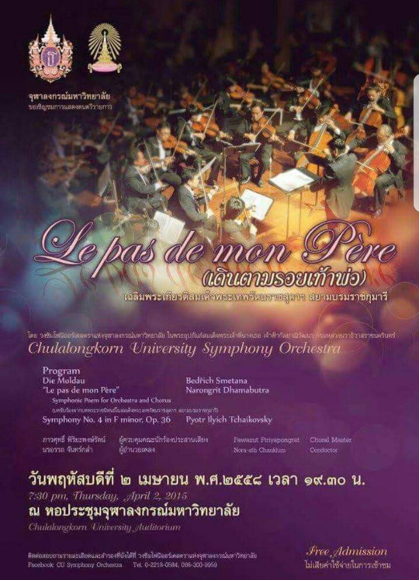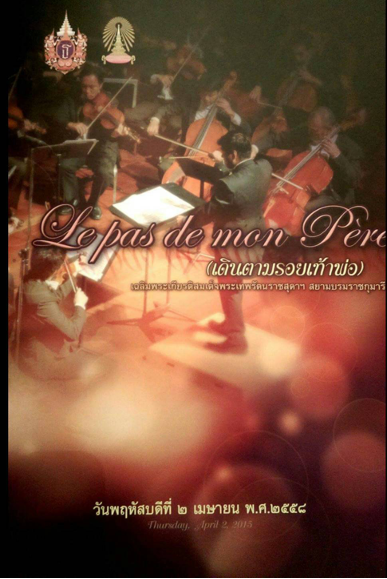 5.7 “Le pas de mon Père” (เดินตามรอยเท้าพ่อ) เป็นซิมโฟนิกโพเอ็มสำหรับวงออร์เคสตราและนักร้องประสานเสียง ความยาว 23 นาที ประพันธ์ขึ้นในปีพ.ศ.2558 โดยได้รับแรงบันดาลใจจากพระราชนิพนธ์บทกวี “Le pas de mon Père” ของสมเด็จพระเทพรัตนราชสุดาฯ สยามบรมราชกุมารี ที่ทรงพระราชนิพนธ์ไว้เป็นภาษาฝรั่งเศส เผยแพร่ในโอกาสต่อไปนี้