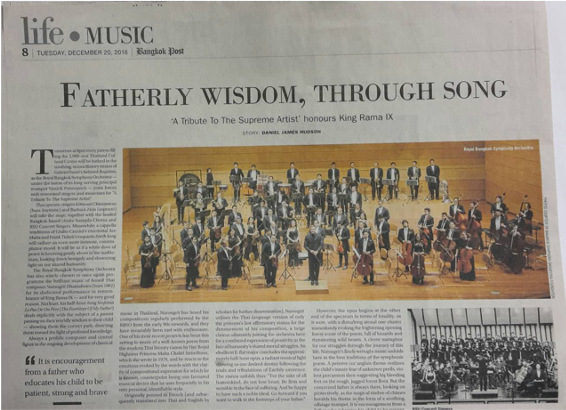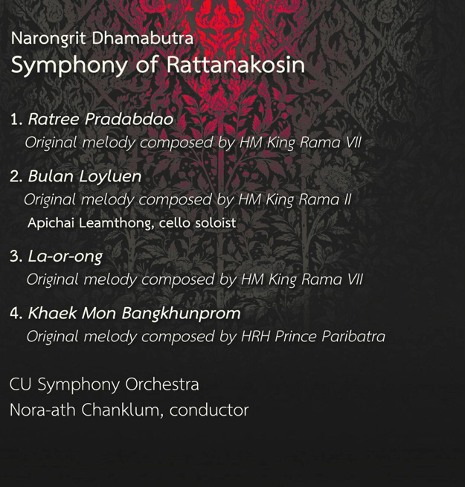 5.12 ซินโฟเนียสยามินทร์ (Sinfonia Siamindra) เป็นซิมโฟนิกโพเอ็ม ความยาว 20 นาที พรรณนาถึงความผูกพันของสถาบันพระมหากษัตริย์กับชาวสยามนับตั้งแต่กรุงสุโขทัยจนถึงราชวงศ์จักรีแห่งกรุงรัตนโกสินทร์ เผยแพร่ในโอกาสต่อไปนี้