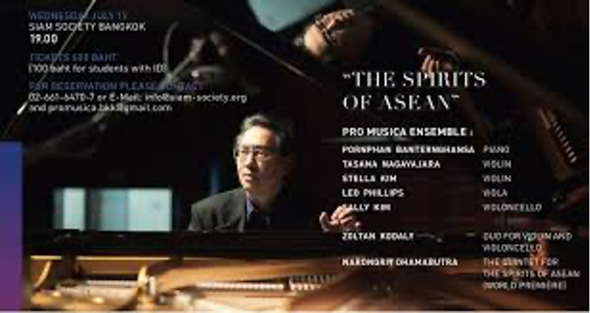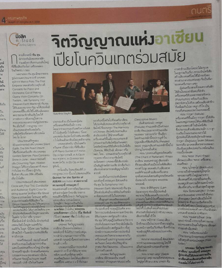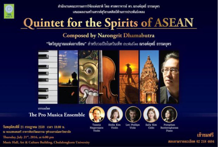 5.8 “จิตวิญญาณแห่งอาเซียน” สำหรับวงเปียโนควินเท็ต (Quintet for the Spirits of ASEAN) ความยาว 50 นาที เป็นบทเพลงขนาดใหญ่สำหรับวงเปียโนควินเท็ต ประกอบด้วย 12 ท่อนที่ประพันธ์จากวัตถุดิบดนตรีจากกลุ่มประเทศอาเซียน เผยแพร่ในโอกาสต่อไปนี้