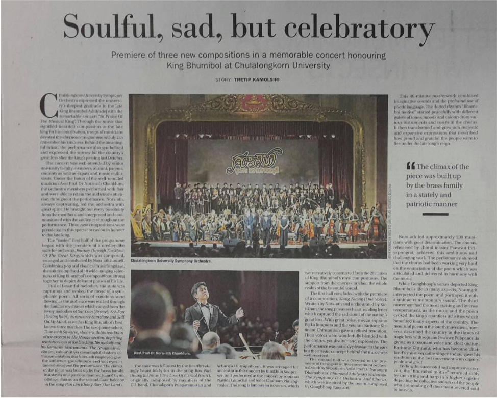 5.11 “ภูมิพลอดุลยเดชมหาราชา” (“Bhumibol Adulyadej Maharaja”) ซิมโฟนีสำหรับวงออร์เคสตรา นักร้องโซปราโนเดี่ยว นักร้องบาริโทนเดี่ยว และนักร้องประสานเสียง ความยาว 43 นาที นับเป็นซิมโฟนีหมายเลข 6 ประพันธ์ขึ้นในนามจุฬาลงกรณ์มหาวิทยาลัยเพื่อร่วมถวายความอาลัยและน้อมรำลึกถึงการเสด็จสวรรคตของพระบาทสมเด็จพระปรมินทรมหาภูมิพลอดุลยเดช ประกอบด้วย 5 ท่อน ได้รับแรงบันดาลใจจากบทกวี “ภูมิพลอดุลยเดชมหาราช” ของก้องภพ รื่นศิริ ประพันธ์ในปีพ.ศ.2560 เผยแพร่ในโอกาสต่อไปนี้