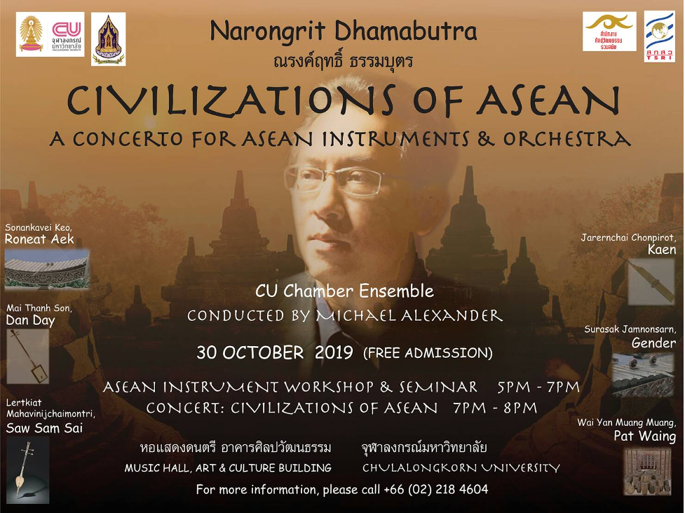 5.18 "อารยธรรมแห่งอุษาคเนย์" (Civilizations of ASEAN) คอนแชร์โตสำหรับเครื่องดนตรีอาเซียนและ เชมเบอร์ออร์เคสตรา ความยาว 30 นาที เผยแพร่ในโอกาสต่อไปนี้